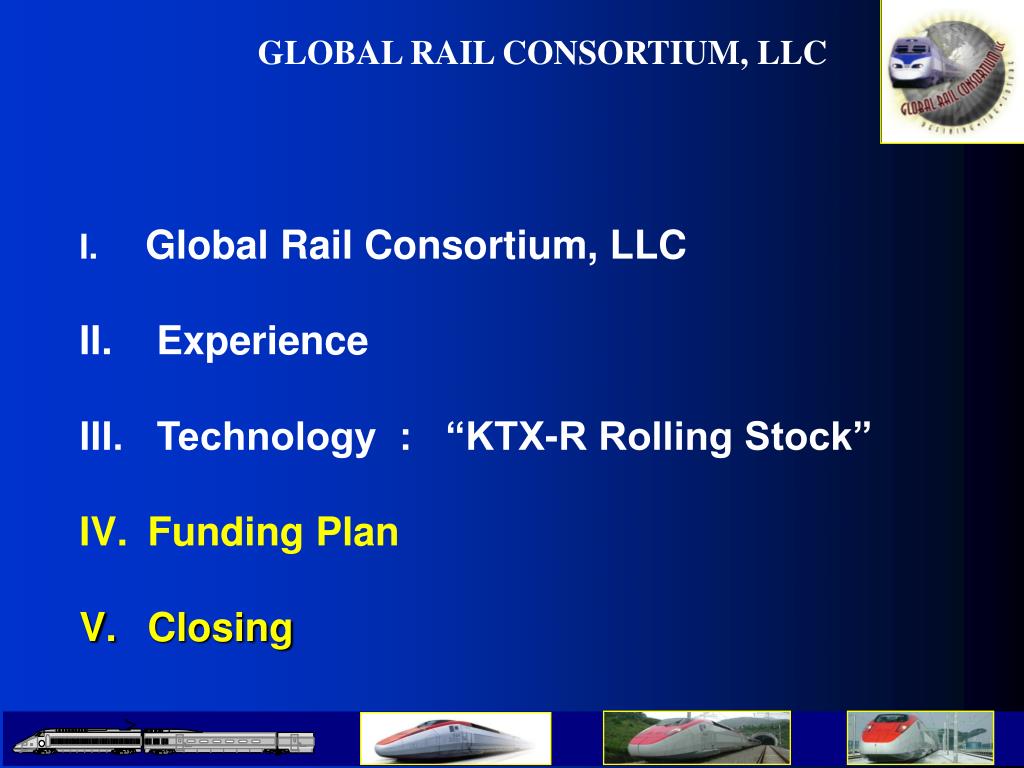 I. Global Rail Consortium, LLC • II. Experience • III. Technology : “KTX-R Rolling Stock” • Funding Plan • Closing