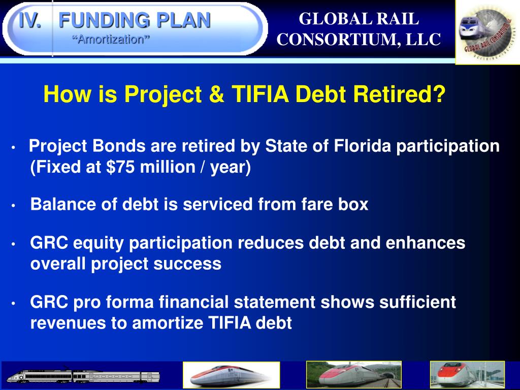 IV. FUNDING PLAN “Amortization” How is Project & TIFIA Debt Retired? • Project Bonds are retired by State of Florida participation • (Fixed at $75 million / year) • Balance of debt is serviced from fare box • GRC equity participation reduces debt and enhances • overall project success • GRC pro forma financial statement shows sufficient • revenues to amortize TIFIA debt