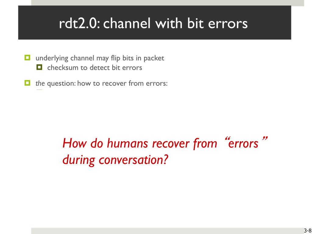 rdt2.0: channel with bit errors • underlying channel may flip bits in packet • checksum to detect bit errors • the question: how to recover from errors: • acknowledgements (ACKs): receiver explicitly tells sender that pkt received OK • negative acknowledgements (NAKs): receiver explicitly tells sender that pkt had errors • sender retransmits pkt on receipt of NAK • new mechanisms in rdt2.0 (beyond rdt1.0): • error detection • receiver feedback: control msgs (ACK,NAK) rcvr->sender How do humans recover from “errors” during conversation?