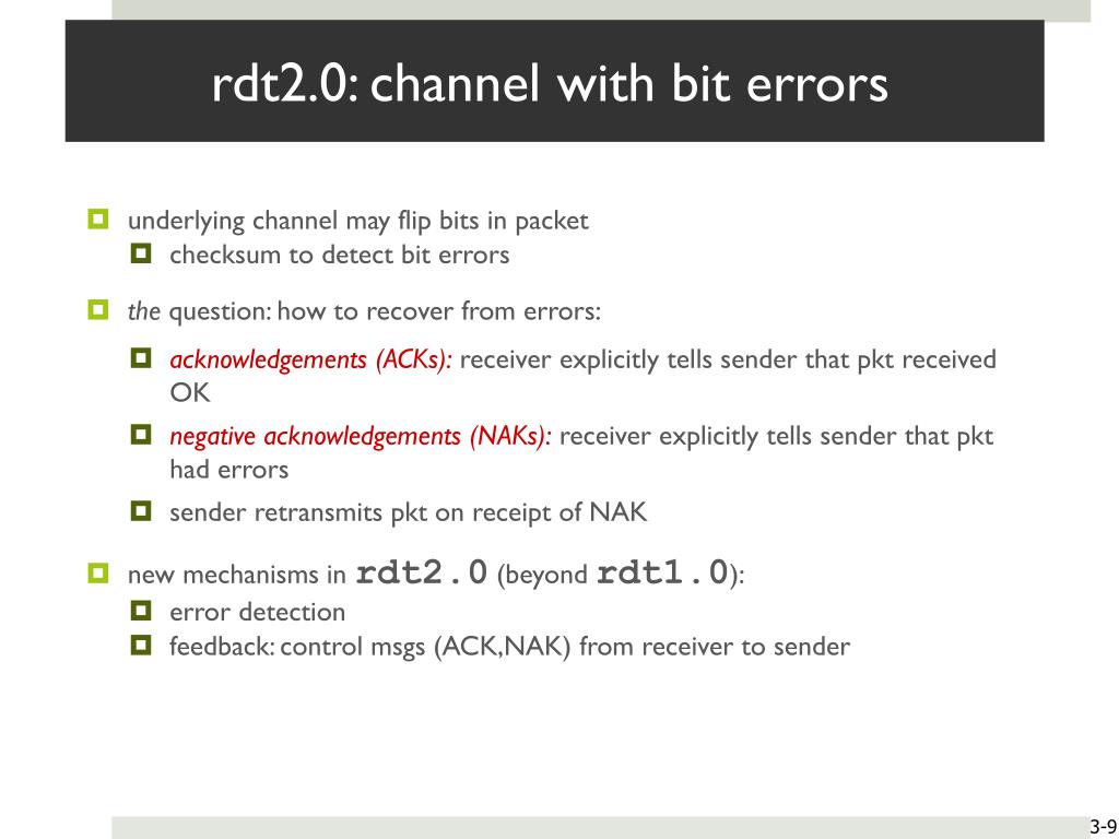 rdt2.0: channel with bit errors • underlying channel may flip bits in packet • checksum to detect bit errors • the question: how to recover from errors: • acknowledgements (ACKs): receiver explicitly tells sender that pkt received OK • negative acknowledgements (NAKs): receiver explicitly tells sender that pkt had errors • sender retransmits pkt on receipt of NAK • new mechanisms in rdt2.0 (beyond rdt1.0): • error detection • feedback: control msgs (ACK,NAK) from receiver to sender