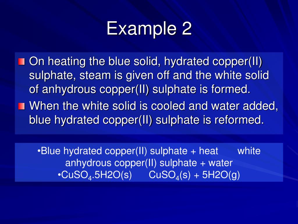 Example 2 • On heating the blue solid, hydrated copper(II) sulphate, steam is given off and the white solid of anhydrous copper(II) sulphate is formed. • When the white solid is cooled and water added, blue hydrated copper(II) sulphate is reformed. • Blue hydrated copper(II) sulphate + heat white anhydrous copper(II) sulphate + water • CuSO4.5H2O(s) CuSO4(s) + 5H2O(g)