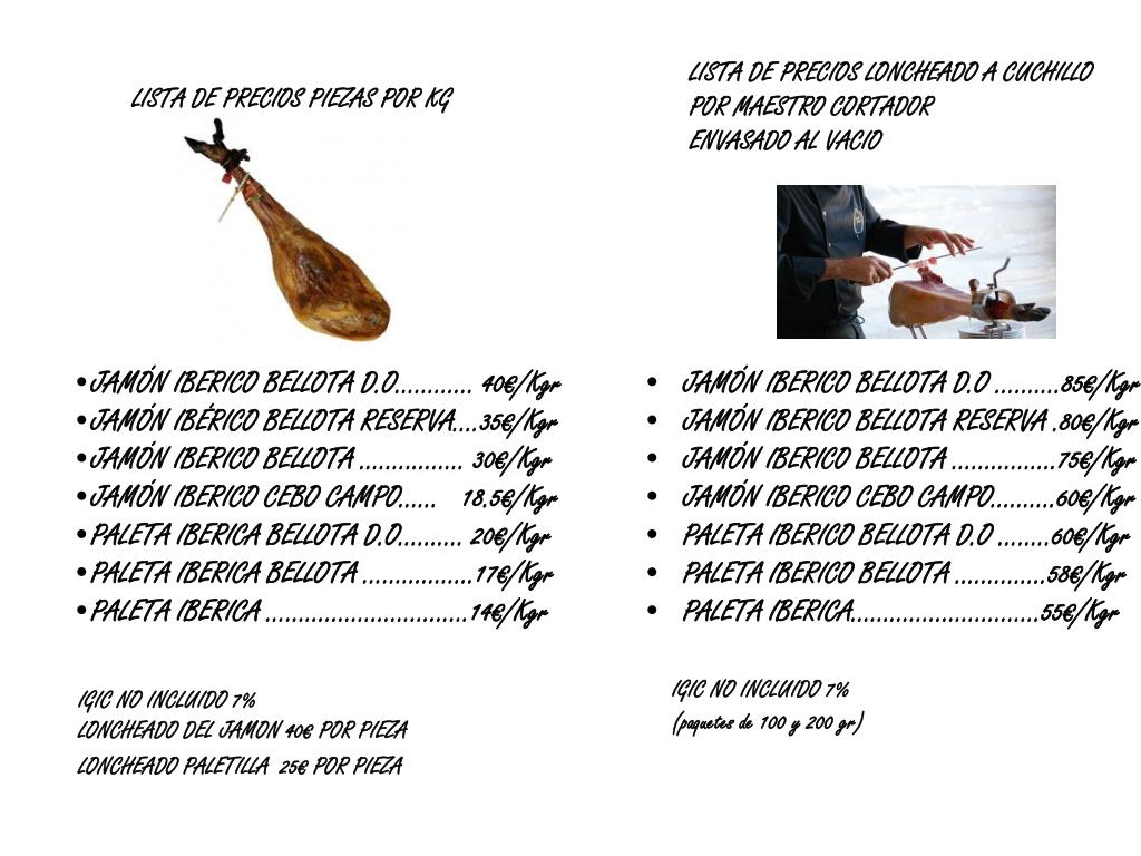 LISTA DE PRECIOS LONCHEADO A CUCHILLO POR MAESTRO CORTADOR ENVASADO AL VACIO LISTA DE PRECIOS PIEZAS POR KG • JAMÓN IBERICO BELLOTA D.O …….…85€/Kgr • JAMÓN IBERICO BELLOTA RESERVA .80€/Kgr • JAMÓN IBERICO BELLOTA …………….75€/Kgr • JAMÓN IBERICO CEBO CAMPO……….60€/Kgr • PALETA IBERICO BELLOTA D.O ……..60€/Kgr • PALETA IBERICO BELLOTA .………….58€/Kgr • PALETA IBERICA…………….………….55€/Kgr IGIC NO INCLUIDO 7% (paquetes de 100 y 200 gr) • JAMÓN IBERICO BELLOTA D.O………… 40€/Kgr • JAMÓN IBÉRICO BELLOTA RESERVA….35€/Kgr • JAMÓN IBERICO BELLOTA .…….…….. 30€/Kgr • JAMÓN IBERICO CEBO CAMPO…… 18.5€/Kgr • PALETA IBERICA BELLOTA D.O………. 20€/Kgr • PALETA IBERICA BELLOTA ……………..17€/Kgr • PALETA IBERICA ………………………….14€/Kgr IGIC NO INCLUIDO 7% LONCHEADO DEL JAMON 40€ POR PIEZA LONCHEADO PALETILLA 25€ POR PIEZA