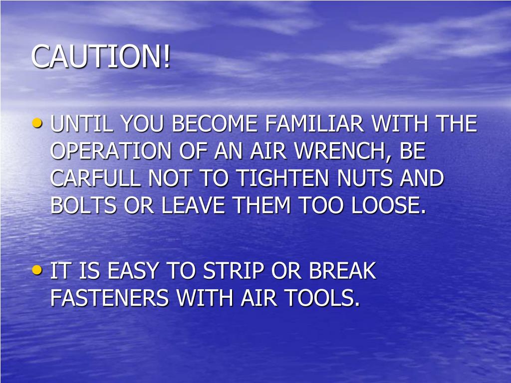 CAUTION! • UNTIL YOU BECOME FAMILIAR WITH THE OPERATION OF AN AIR WRENCH, BE CARFULL NOT TO TIGHTEN NUTS AND BOLTS OR LEAVE THEM TOO LOOSE. • IT IS EASY TO STRIP OR BREAK FASTENERS WITH AIR TOOLS.
