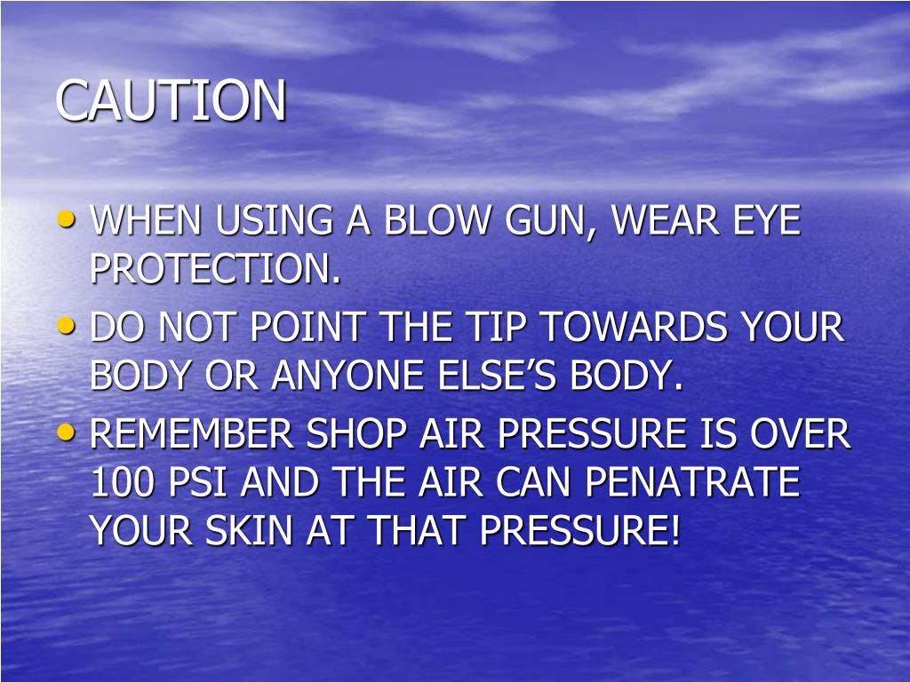 CAUTION • WHEN USING A BLOW GUN, WEAR EYE PROTECTION. • DO NOT POINT THE TIP TOWARDS YOUR BODY OR ANYONE ELSE’S BODY. • REMEMBER SHOP AIR PRESSURE IS OVER 100 PSI AND THE AIR CAN PENATRATE YOUR SKIN AT THAT PRESSURE!