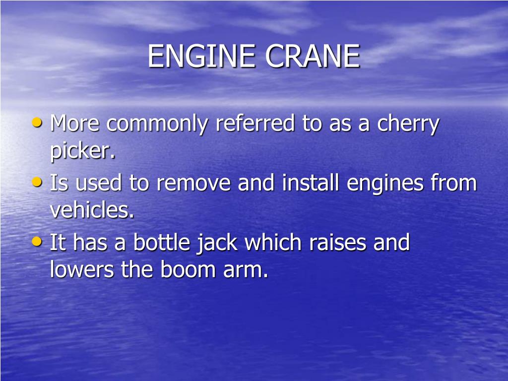 ENGINE CRANE • More commonly referred to as a cherry picker. • Is used to remove and install engines from vehicles. • It has a bottle jack which raises and lowers the boom arm.