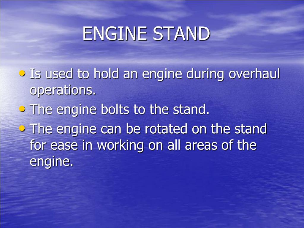 ENGINE STAND • Is used to hold an engine during overhaul operations. • The engine bolts to the stand. • The engine can be rotated on the stand for ease in working on all areas of the engine.