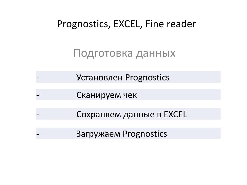 Prognostics, EXCEL, Fine reader. Подготовка данных. Prognostics установлен. Сканируем чек магазина. Передаем скан сразу в EXCEL. Переносим данные в таблицу для хранения. Prognostics устанавливается не сразу. Соглашаемся с Лицензионным соглашением. Ввод, расчет и сохранение данных.