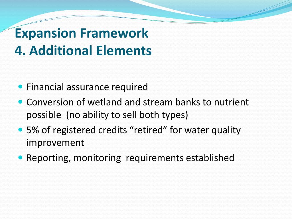 Expansion Framework 4. Additional Elements • Financial assurance required • Conversion of wetland and stream banks to nutrient possible (no ability to sell both types) • 5% of registered credits “retired” for water quality improvement • Reporting, monitoring requirements established