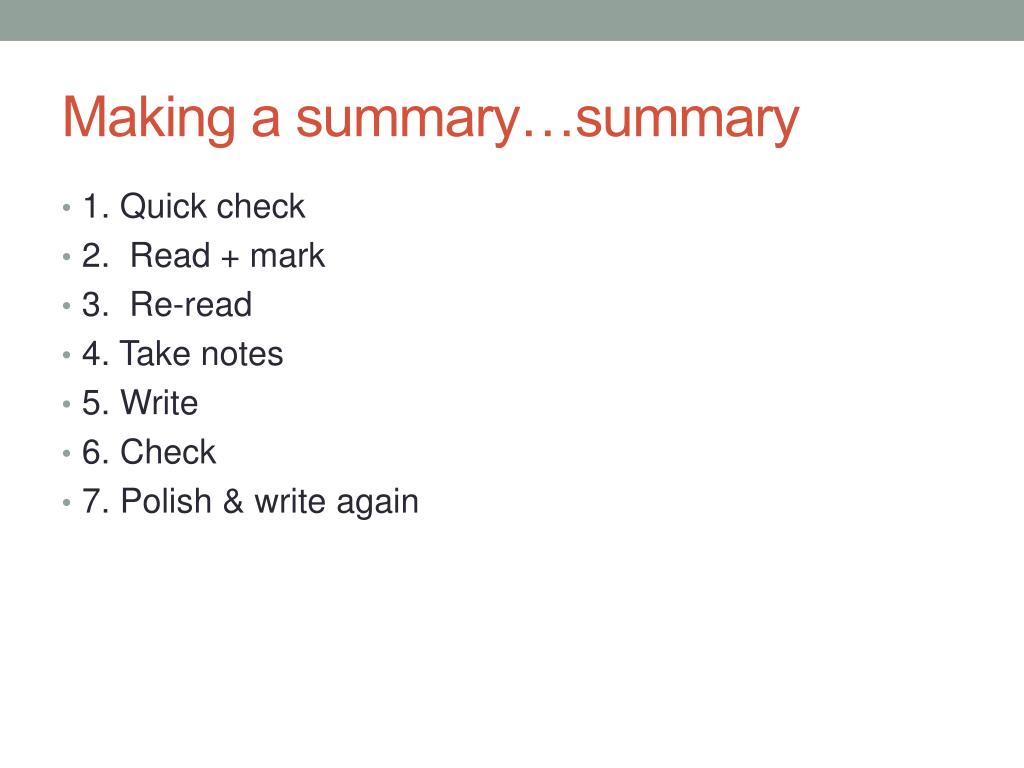 Making a summary…summary • 1. Quick check • 2. Read + mark • 3. Re-read • 4. Take notes • 5. Write • 6. Check • 7. Polish & write again
