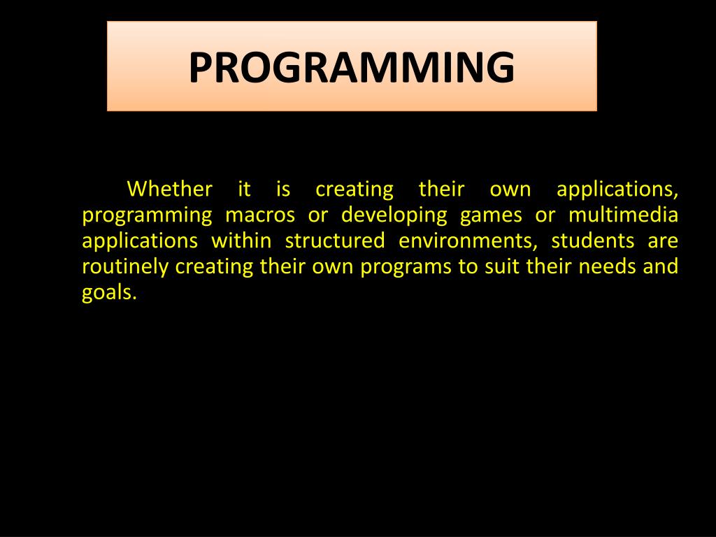 PROGRAMMING Whether it is creating their own applications, programming macros or developing games or multimedia applications within structured environments, students are routinely creating their own programs to suit their needs and goals.