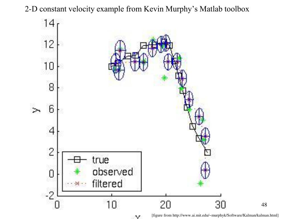 2-D constant velocity example from Kevin Murphy’s Matlab toolbox [figure from http://www.ai.mit.edu/~murphyk/Software/Kalman/kalman.html]