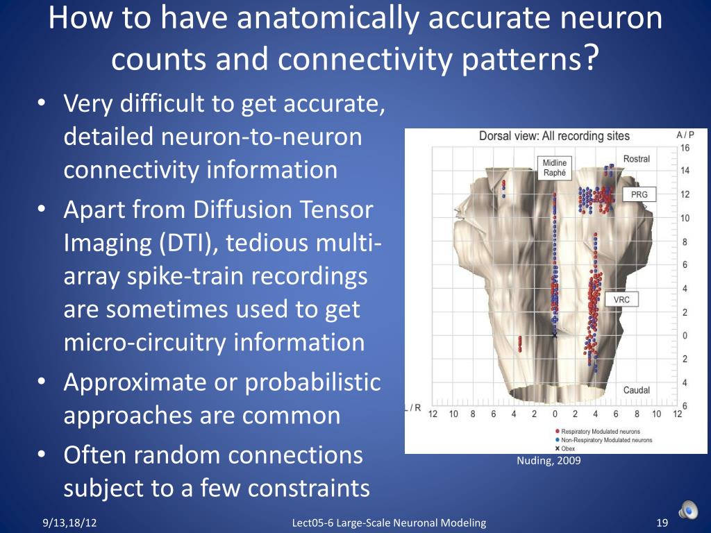 How to have anatomically accurate neuron counts and connectivity patterns? • Very difficult to get accurate, detailed neuron-to-neuron connectivity information • Apart from Diffusion Tensor Imaging (DTI), tedious multi-array spike-train recordings are sometimes used to get micro-circuitry information • Approximate or probabilistic approaches are common • Often random connections subject to a few constraints Nuding, 2009 Lect05-6 Large-Scale Neuronal Modeling