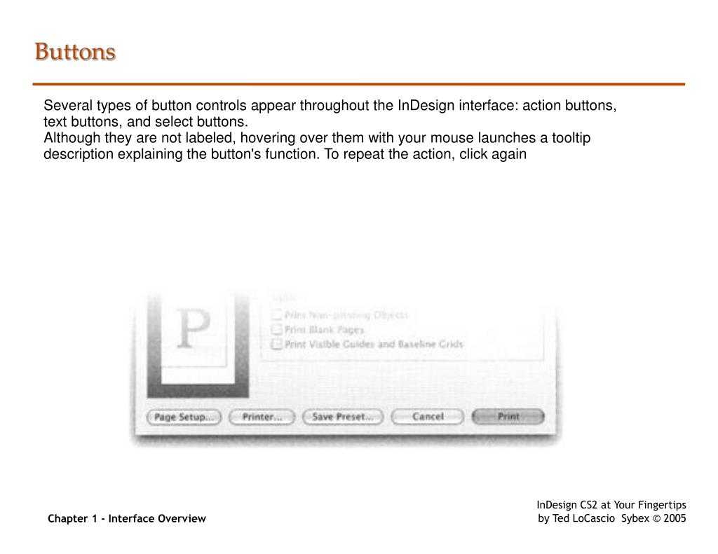 19. Chapter 1 - Interface Overview Buttons Several types of button controls appear throughout the InDesign interface: action buttons, text buttons, and select buttons. Although they are not labeled, hovering over them with your mouse launches a tooltip description explaining the button's function. To repeat the action, click again