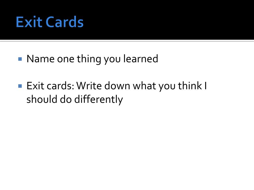 Exit Cards • Name one thing you learned • Exit cards: Write down what you think I should do differently