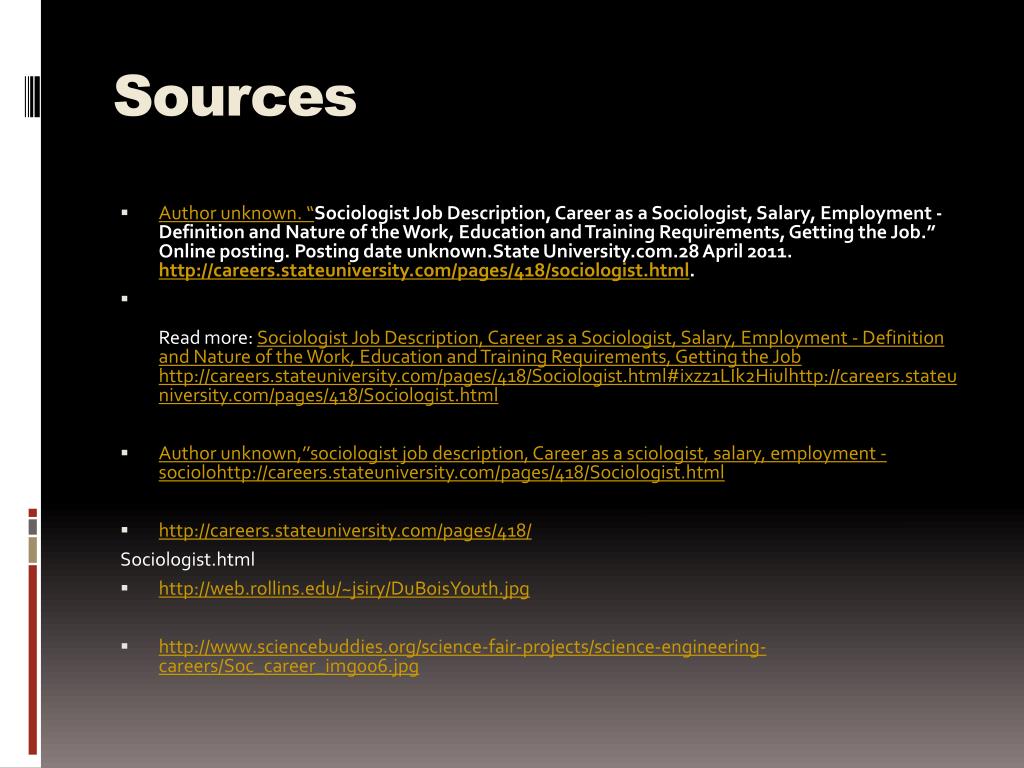 Sources • Author unknown. “Sociologist Job Description, Career as a Sociologist, Salary, Employment - Definition and Nature of the Work, Education and Training Requirements, Getting the Job.” Online posting. Posting date unknown.State University.com.28 April 2011. http://careers.stateuniversity.com/pages/418/sociologist.html. • Read more: Sociologist Job Description, Career as a Sociologist, Salary, Employment - Definition and Nature of the Work, Education and Training Requirements, Getting the Jobhttp://careers.stateuniversity.com/pages/418/Sociologist.html#ixzz1LIk2Hiulhttp://careers.stateuniversity.com/pages/418/Sociologist.html • Author unknown,’’sociologist job description, Career as a sciologist, salary, employment - sociolohttp://careers.stateuniversity.com/pages/418/Sociologist.html • http://careers.stateuniversity.com/pages/418/ Sociologist.html • http://web.rollins.edu/~jsiry/DuBoisYouth.jpg • http://www.sciencebuddies.org/science-fair-projects/science-engineering-careers/Soc_career_img006.jpg