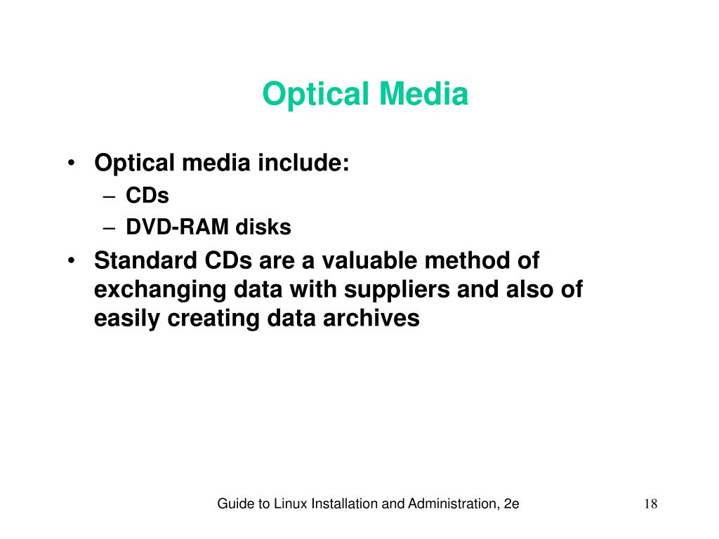 Optical Media • Optical media include: • CDs • DVD-RAM disks • Standard CDs are a valuable method of exchanging data with suppliers and also of easily creating data archives Guide to Linux Installation and Administration, 2e