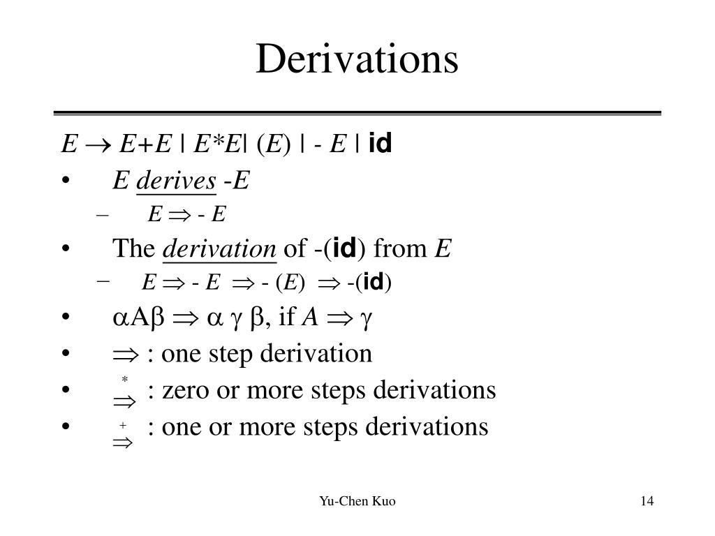 Derivations E E+E | E*E| (E) | - E | id • Ederives -E • E - E • The derivation of -(id) from E • E - E - (E) -(id) • A , if A • : one step derivation • : zero or more steps derivations • : one or more steps derivations Yu-Chen Kuo