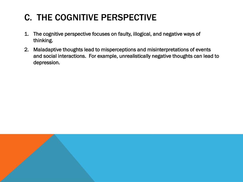 C. The Cognitive Perspective • The cognitive perspective focuses on faulty, illogical, and negative ways of thinking. • Maladaptive thoughts lead to misperceptions and misinterpretations of events and social interactions. For example, unrealistically negative thoughts can lead to depression.
