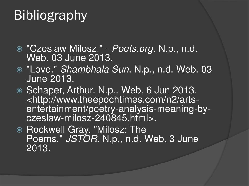Bibliography • "Czeslaw Milosz." - Poets.org. N.p., n.d. Web. 03 June 2013. • "Love." Shambhala Sun. N.p., n.d. Web. 03 June 2013. • Schaper, Arthur. N.p.. Web. 6 Jun 2013. <http://www.theepochtimes.com/n2/arts-entertainment/poetry-analysis-meaning-by-czeslaw-milosz-240845.html>. • Rockwell Gray. "Milosz: The Poems." JSTOR. N.p., n.d. Web. 3 June 2013.