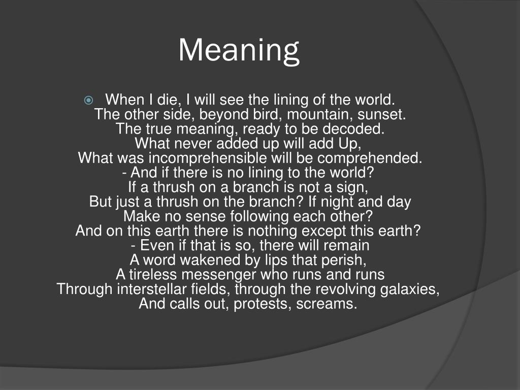 Analysis of Meaning • Czeslaw Milosz was a member of a resistance against the Nazi occupation. He wrote this poem to have an optimistic view of life which was almost impossible at the time. He write is in free verse with no rhyme scheme at all. By listing “sunset” in the final of three terms, the poet indicates the twilight of established orders, the fading of hopes and dreams, and the sad certainty that all beautiful things, must ultimately disappear and give way to blackness and night.“The true meaning” is a loaded phrase, including the word “true”, which elicits respect and derision. For the poet, the “true meaning,” the end of the story, the resolution of all things, will be revealed. The missing pieces of one’s broken life will come together and “add Up.” The capitalization of this little preposition, positioned at the very end, suggests that the open security of whatever questions have puzzled mankind will have found their peaceful termination. Milosz expresses his faithful belief of a world “beyond” this world.“There will remain,” continues the poet, “a word wakened by lips that perish.” “Perish” implies complete disappearance, without a trace. “Through interstellar fields, through the revolving galaxies—beyond the thrushes, the branches, the senseless night and day. And calls out, protests, and screams.” Milosz’s “Meaning” contends that life is not a joke. This one word lives and breathes in every one who believes.