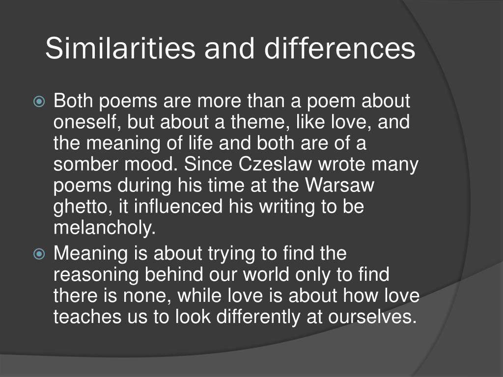 Similarities and differences • Both poems are more than a poem about oneself, but about a theme, like love, and the meaning of life and both are of a somber mood. Since Czeslaw wrote many poems during his time at the Warsaw ghetto, it influenced his writing to be melancholy. • Meaning is about trying to find the reasoning behind our world only to find there is none, while love is about how love teaches us to look differently at ourselves.
