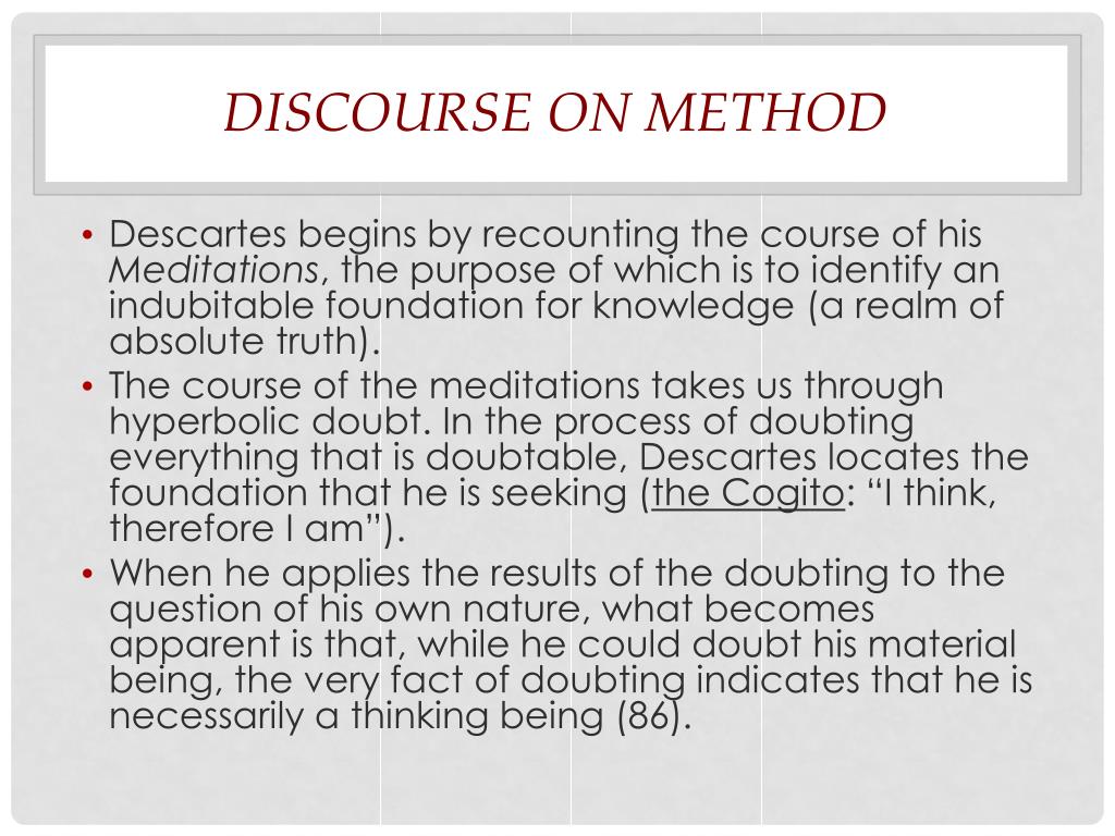 Discourse on Method • Descartes begins by recounting the course of his Meditations, the purpose of which is to identify an indubitable foundation for knowledge (a realm of absolute truth). • The course of the meditations takes us through hyperbolic doubt. In the process of doubting everything that is doubtable, Descartes locates the foundation that he is seeking (the Cogito: “I think, therefore I am”). • When he applies the results of the doubting to the question of his own nature, what becomes apparent is that, while he could doubt his material being, the very fact of doubting indicates that he is necessarily a thinking being (86).