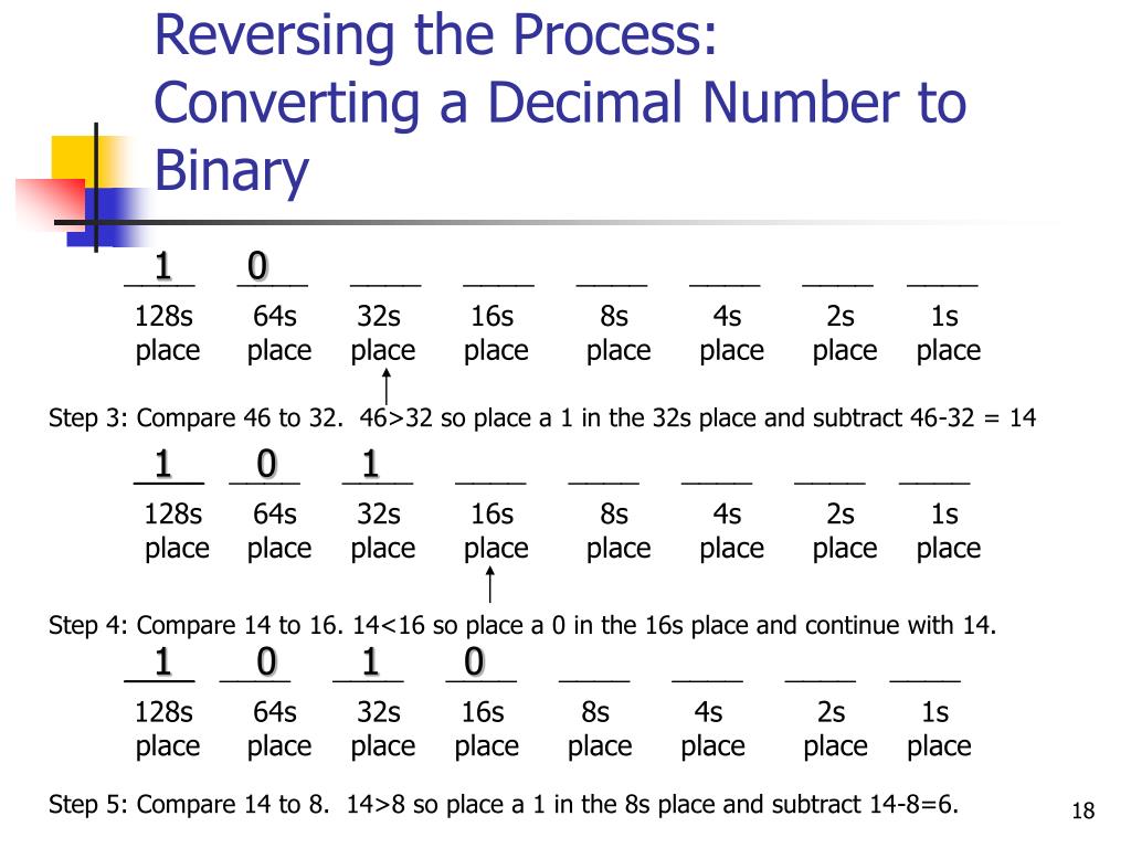 1 0 1 0 1 ____ ____ ____ ____ ____ ____ ____ ____ 128s place 64s place 32s place 16s place 8s place 4s place 2s place 1s place Step 6: Compare 6 to 4. 6>4 so place a 1 in the 4s place and subtract 6-4=2. 1 0 1 0 1 1 ____ ____ ____ ____ ____ ____ ____ ____ 128s place 64s place 32s place 16s place 8s place 4s place 2s place 1s place Step 7: Compare 2 to 2. 2=2 so place a 1 in the 2s place and subtract 2-2=0. There is no remainder left to convert, so also place a 0 in the 1s place. 1 0 1 0 1 1 1 0 ____ ____ ____ ____ ____ ____ ____ ____ 128s place 64s place 32s place 16s place 8s place 4s place 2s place 1s place The decimal number 174 has been converted to the binary number 10101110