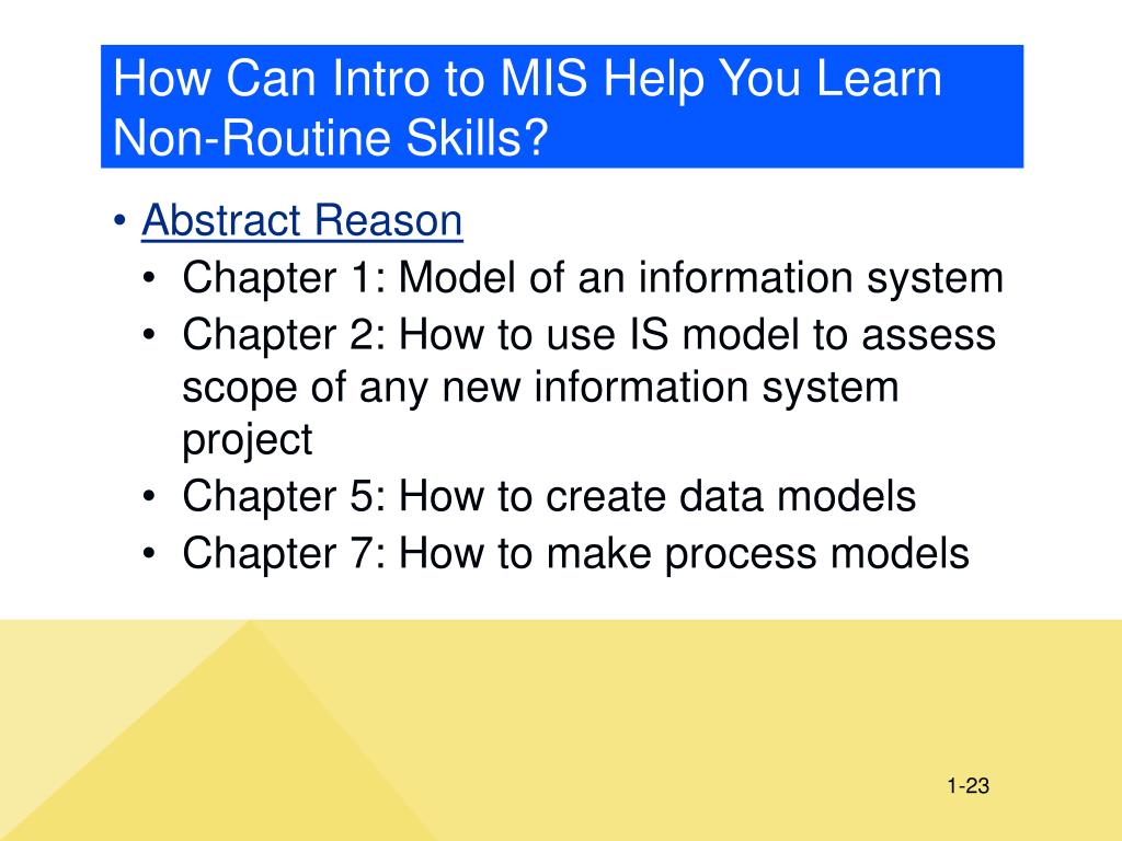 How Can Intro to MIS Help You Learn Non-Routine Skills? • Abstract Reason • Chapter 1: Model of an information system • Chapter 2: How to use IS model to assess scope of any new information system project • Chapter 5: How to create data models • Chapter 7: How to make process models