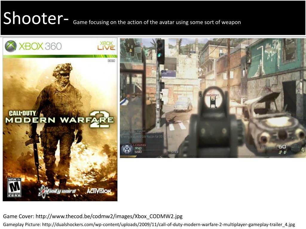 Shooter- Game focusing on the action of the avatar using some sort of weapon Game Cover: http://www.thecod.be/codmw2/images/Xbox_CODMW2.jpg Gameplay Picture: http://dualshockers.com/wp-content/uploads/2009/11/call-of-duty-modern-warfare-2-multiplayer-gameplay-trailer_4.jpg