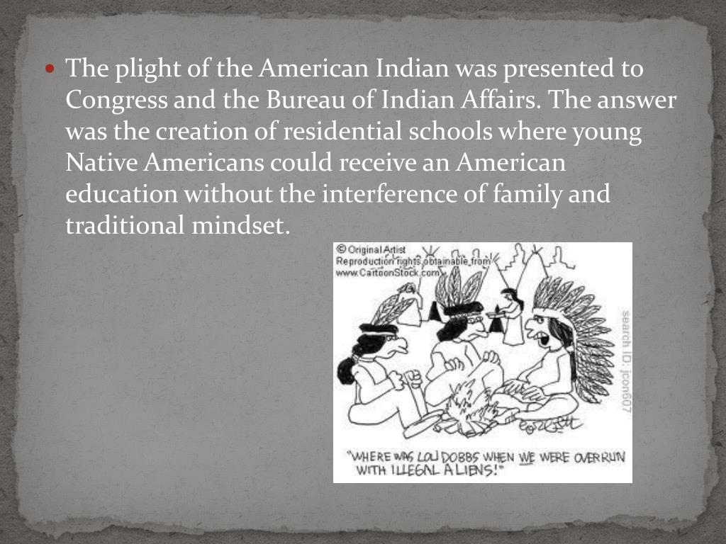 The plight of the American Indian was presented to Congress and the Bureau of Indian Affairs. The answer was the creation of residential schools where young Native Americans could receive an American education without the interference of family and traditional mindset.