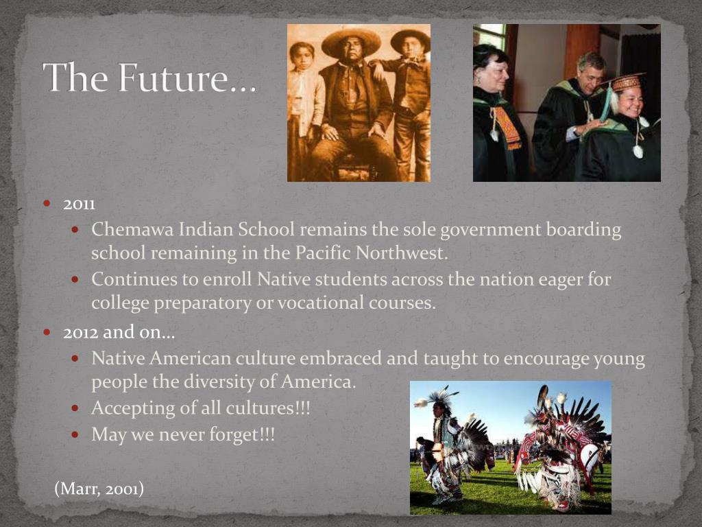The Future… • 2011 • Chemawa Indian School remains the sole government boarding school remaining in the Pacific Northwest. • Continues to enroll Native students across the nation eager for college preparatory or vocational courses. • 2012 and on… • Native American culture embraced and taught to encourage young people the diversity of America. • Accepting of all cultures!!! • May we never forget!!! (Marr, 2001)