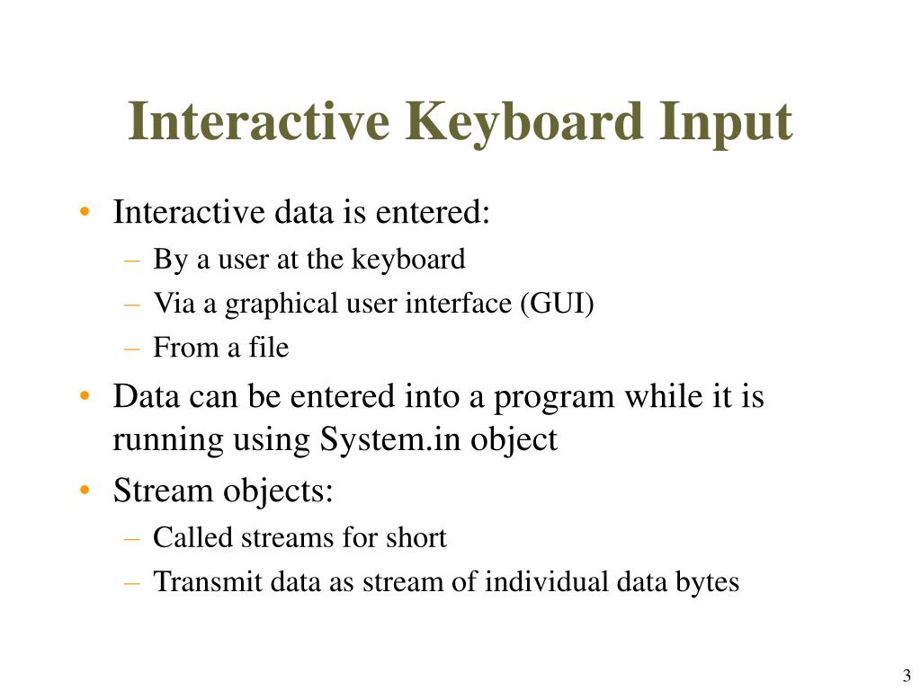 Interactive Keyboard Input • Interactive data is entered: • By a user at the keyboard • Via a graphical user interface (GUI) • From a file • Data can be entered into a program while it is running using System.in object • Stream objects: • Called streamsfor short • Transmit data as stream of individual data bytes