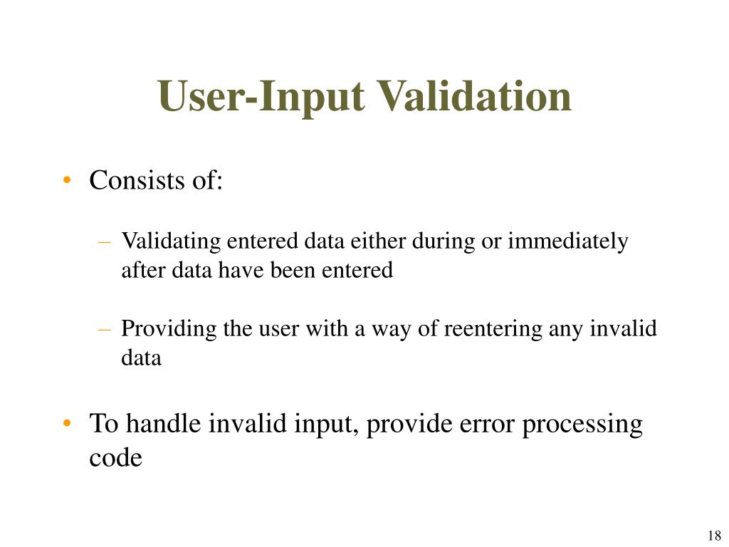 User-Input Validation • Consists of: • Validating entered data either during or immediately after data have been entered • Providing the user with a way of reentering any invalid data • To handle invalid input, provide error processing code