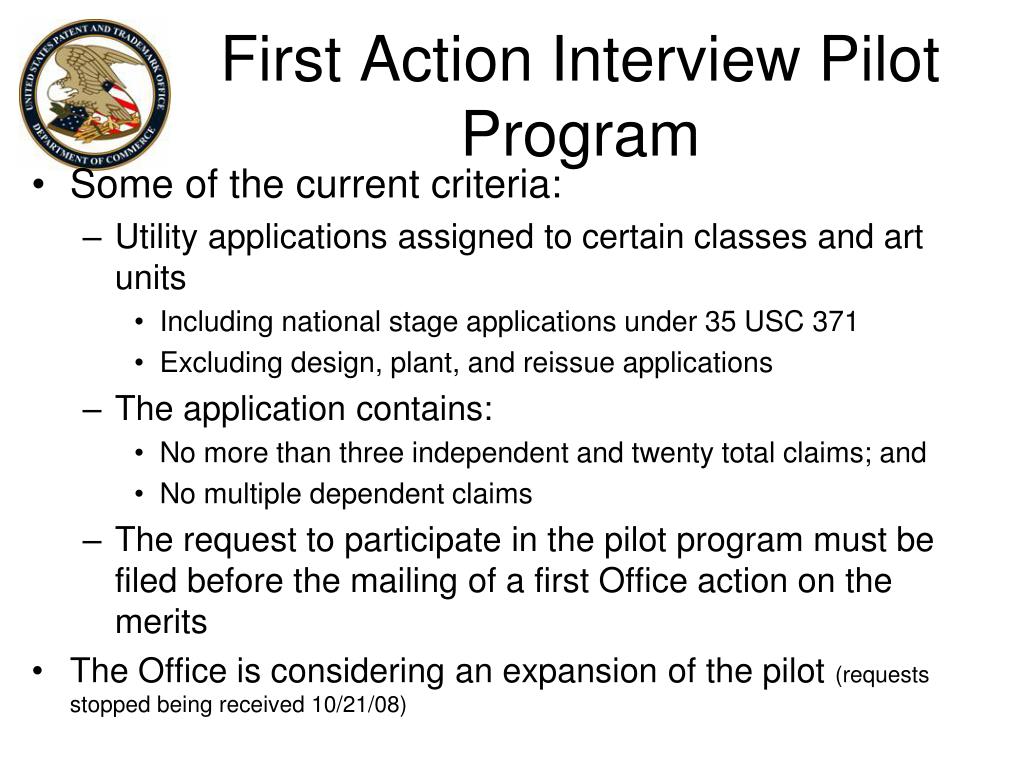 First Action Interview Pilot Program • Some of the current criteria: • Utility applications assigned to certain classes and art units • Including national stage applications under 35 USC 371 • Excluding design, plant, and reissue applications • The application contains: • No more than three independent and twenty total claims; and • No multiple dependent claims • The request to participate in the pilot program must be filed before the mailing of a first Office action on the merits • The Office is considering an expansion of the pilot (requests stopped being received 10/21/08)