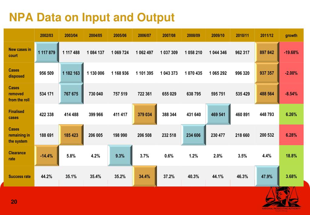 Assessing the National Prosecuting Authority (NPA) Complexities and Possibilities Tuesday 20 Nov. 2012 ADV N JIBA Acting National Director of Public Prosecutions. General Prosecution Performance. Vision & Mission Statement . Source Documents. NPA Strategic Overview.