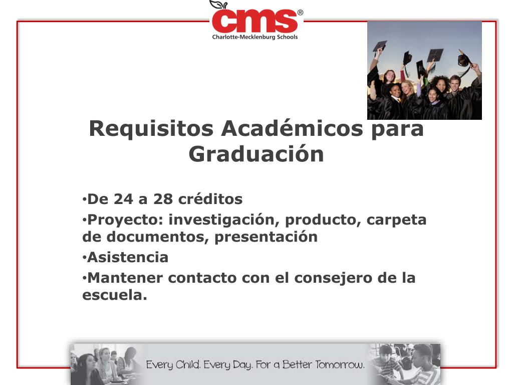 Requisitos Académicos para Graduación De 24 a 28 créditos Proyecto: investigación, producto, carpeta de documentos, presentación Asistencia Mantener contacto con el consejero de la escuela.