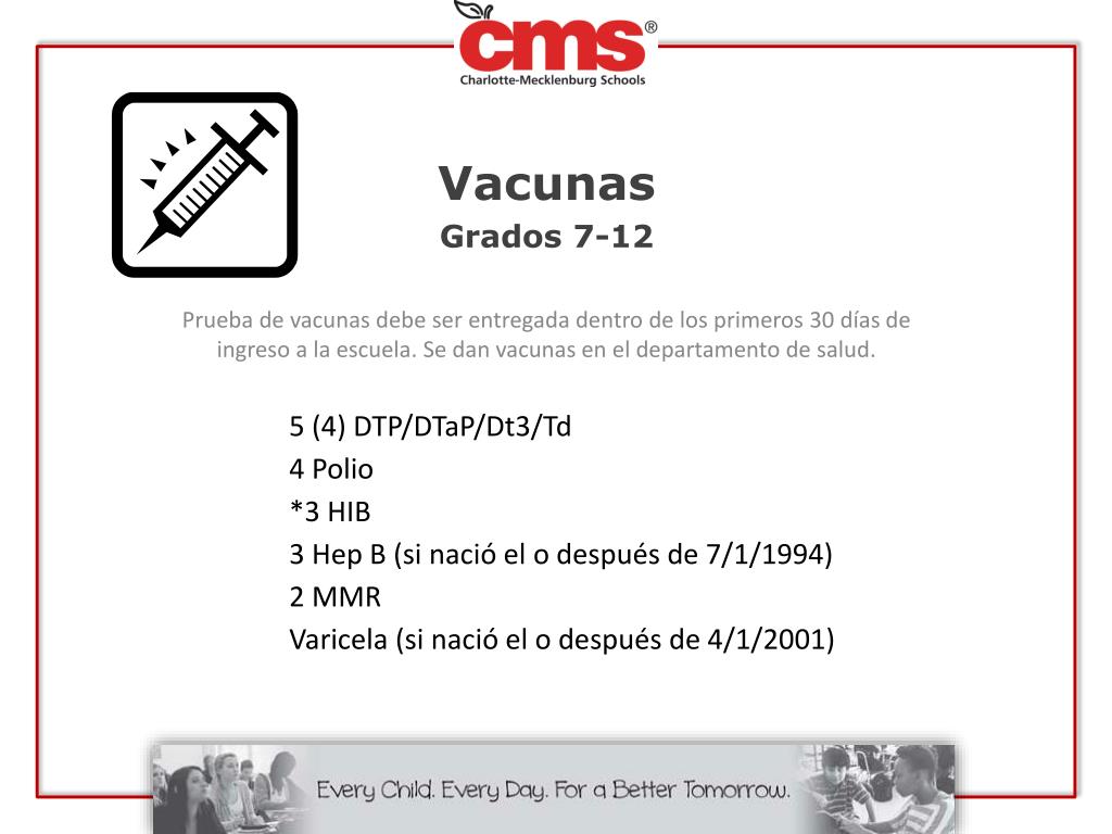 5 (4) DTP/DTaP/Dt3/Td4 Polio*3 HIB3 Hep B (si nació el o después de 7/1/1994)2 MMRVaricela (si nació el o después de 4/1/2001) Vacunas Grados 7-12 Prueba de vacunas debe ser entregada dentro de los primeros 30 días de ingreso a la escuela. Se dan vacunas en el departamento de salud.