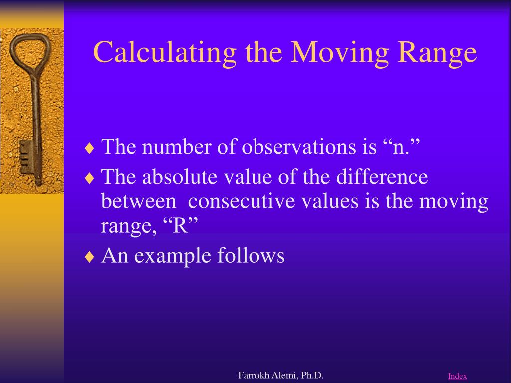 Calculating the Average Moving Range Add the differences and divide by n minus one to get the average moving range. Mean R = |(Xt - Xt-1)| / (n-1) Farrokh Alemi, Ph.D.