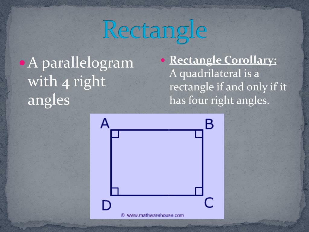 Rectangle • A parallelogram with 4 right angles • Rectangle Corollary: A quadrilateral is a rectangle if and only if it has four right angles.