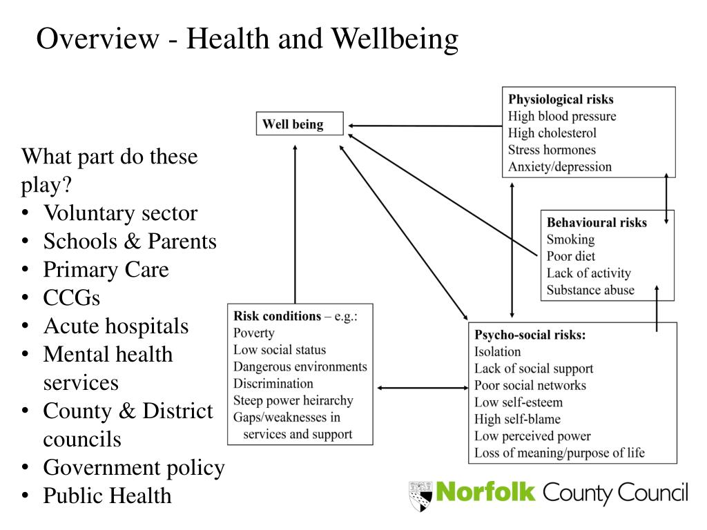 Overview - Health and Wellbeing • What part do these play? • Voluntary sector • Schools & Parents • Primary Care • CCGs • Acute hospitals • Mental health services • County & District councils • Government policy • Public Health