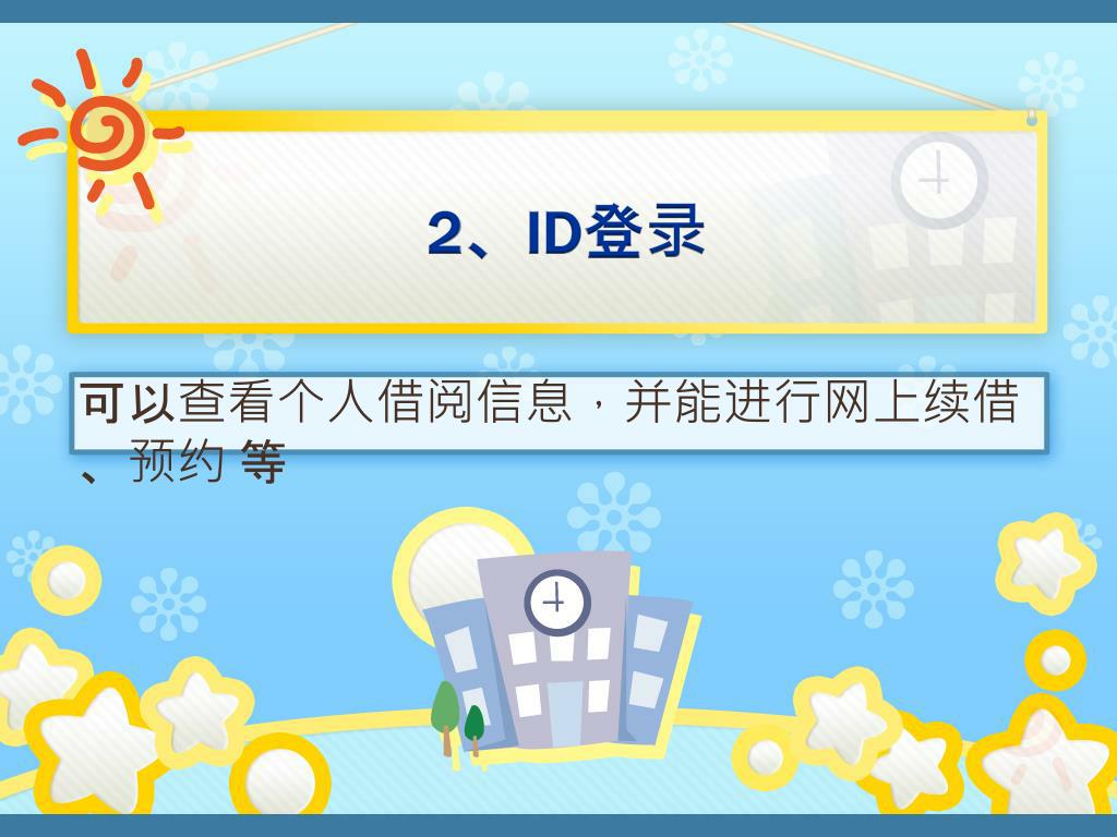 2、ID登录 可以查看个人借阅信息,并能进行网上续借、预约 等