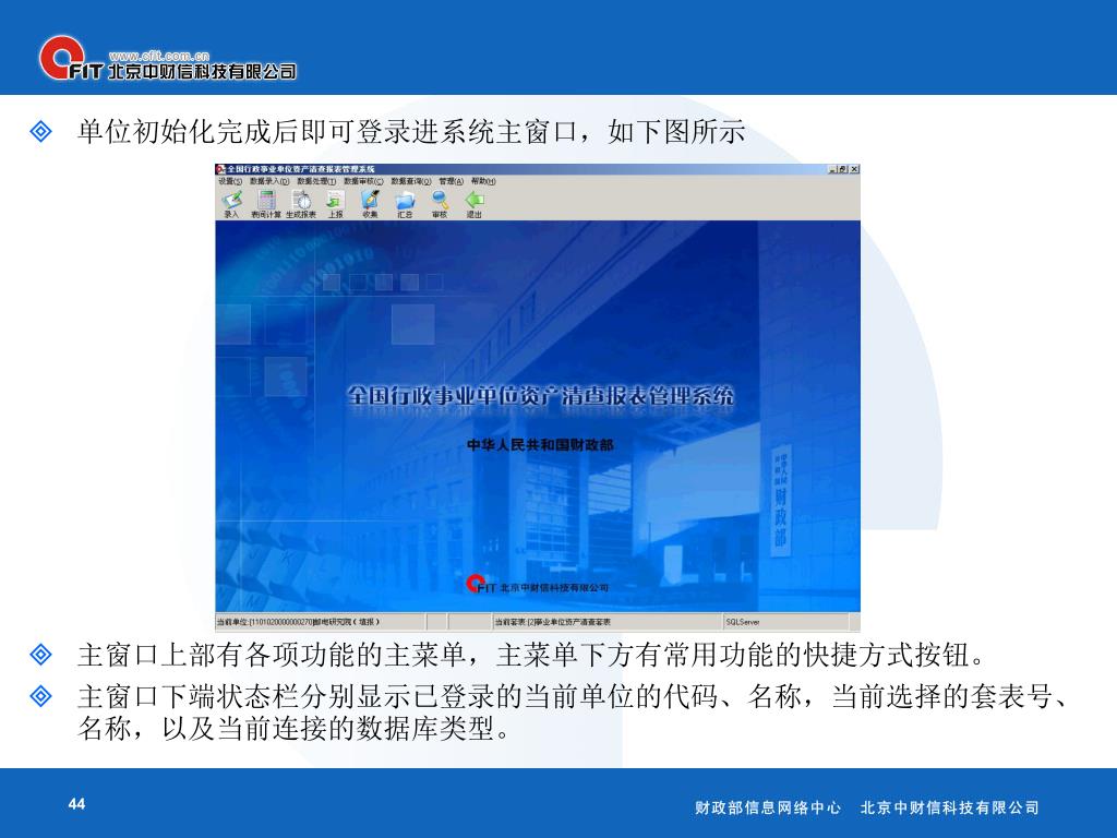 系统简介 • 为配合全国行政、事业单位资产清查工作,北京中财信科技有限公司开发了“全国行政事业单位资产清查报表管理系统”。该系统按照资产清查工作的要求,采用了新的技术平台,在功能性、可靠性、效率、易用性等方面都有较大的提升。 • 该系统由“行政事业单位资产卡片管理系统”(简称卡片系统)和“全国行政事业单位资产清查报表管理系统”(简称清查系统)两个子系统组成。 • 卡片系统提供了固定资产卡片(包括帐实相符资产、盘盈资产)的录入、查询、打印、删除、导入外部数据、生成清查系统文件、备份、恢复等功能。 • 清查系统提供了从固定资产卡片提取数据到基础表,基础表间计算,提取基础表数据到报表、汇总报表,以及单位管理,数据的录入、打印、导入、导出、上报、收集、汇总、审核、查询、备份、恢复等功能。
