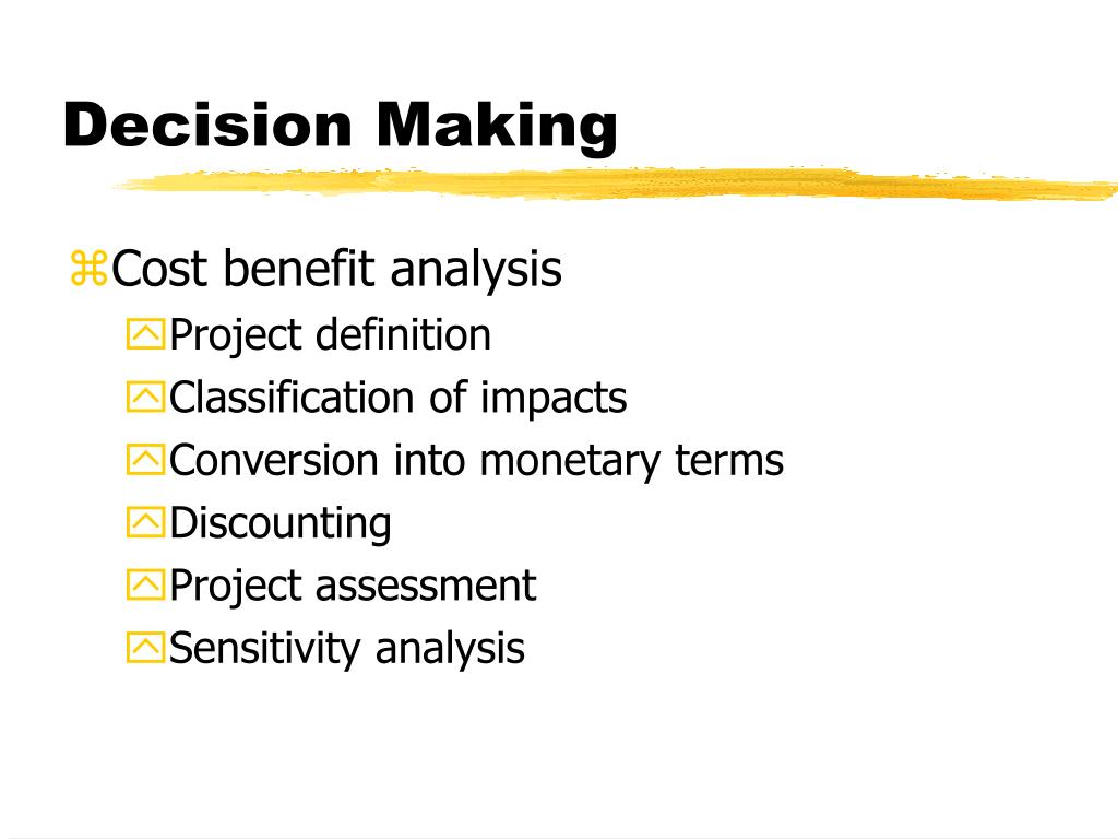 Decision Making • Cost benefit analysis • Project definition • Classification of impacts • Conversion into monetary terms • Discounting • Project assessment • Sensitivity analysis