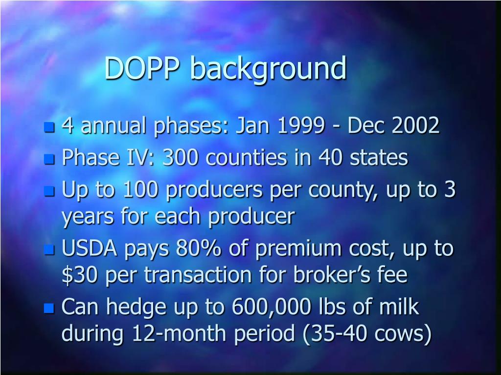 DOPP background • 4 annual phases: Jan 1999 - Dec 2002 • Phase IV: 300 counties in 40 states • Up to 100 producers per county, up to 3 years for each producer • USDA pays 80% of premium cost, up to $30 per transaction for broker’s fee • Can hedge up to 600,000 lbs of milk during 12-month period (35-40 cows)