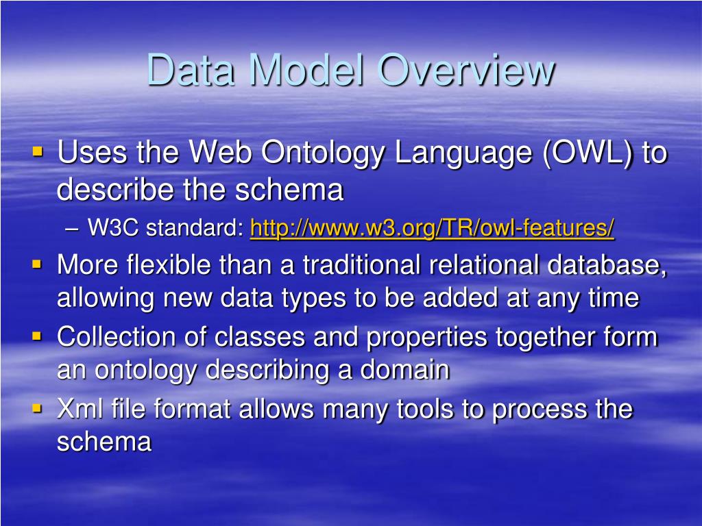Data Model Overview • Uses the Web Ontology Language (OWL) to describe the schema • W3C standard: http://www.w3.org/TR/owl-features/ • More flexible than a traditional relational database, allowing new data types to be added at any time • Collection of classes and properties together form an ontology describing a domain • Xml file format allows many tools to process the schema