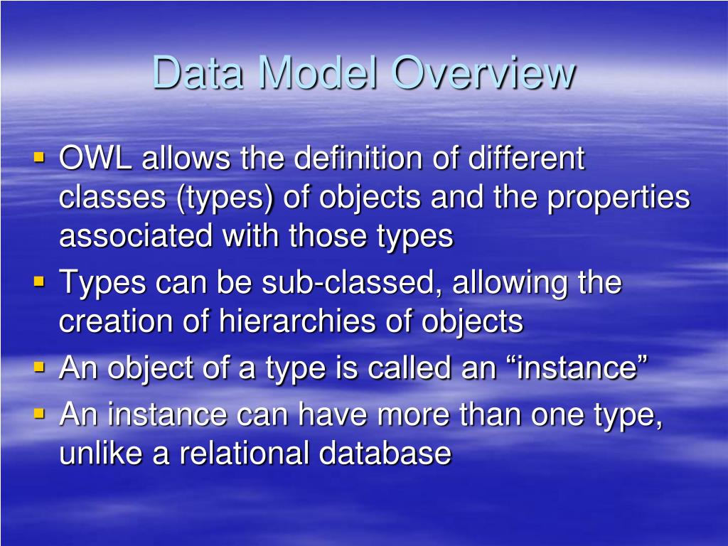 Data Model Overview • OWL allows the definition of different classes (types) of objects and the properties associated with those types • Types can be sub-classed, allowing the creation of hierarchies of objects • An object of a type is called an “instance” • An instance can have more than one type, unlike a relational database