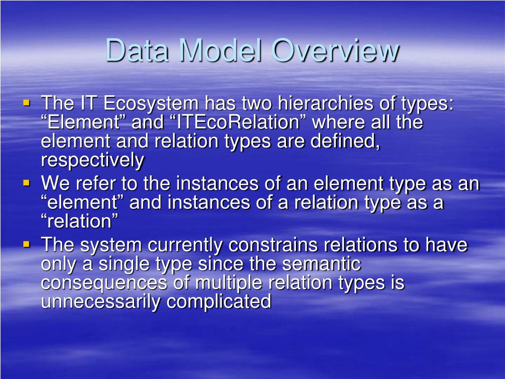 Data Model Overview • The IT Ecosystem has two hierarchies of types: “Element” and “ITEcoRelation” where all the element and relation types are defined, respectively • We refer to the instances of an element type as an “element” and instances of a relation type as a “relation” • The system currently constrains relations to have only a single type since the semantic consequences of multiple relation types is unnecessarily complicated