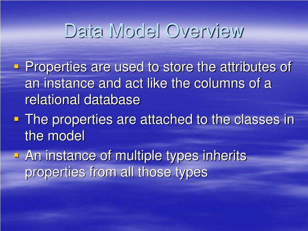 Data Model Overview • Properties are used to store the attributes of an instance and act like the columns of a relational database • The properties are attached to the classes in the model • An instance of multiple types inherits properties from all those types