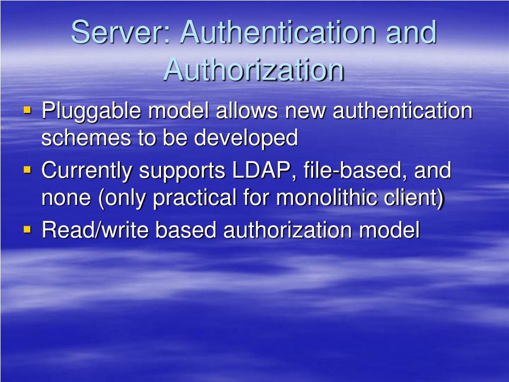 Server: Authentication and Authorization • Pluggable model allows new authentication schemes to be developed • Currently supports LDAP, file-based, and none (only practical for monolithic client) • Read/write based authorization model
