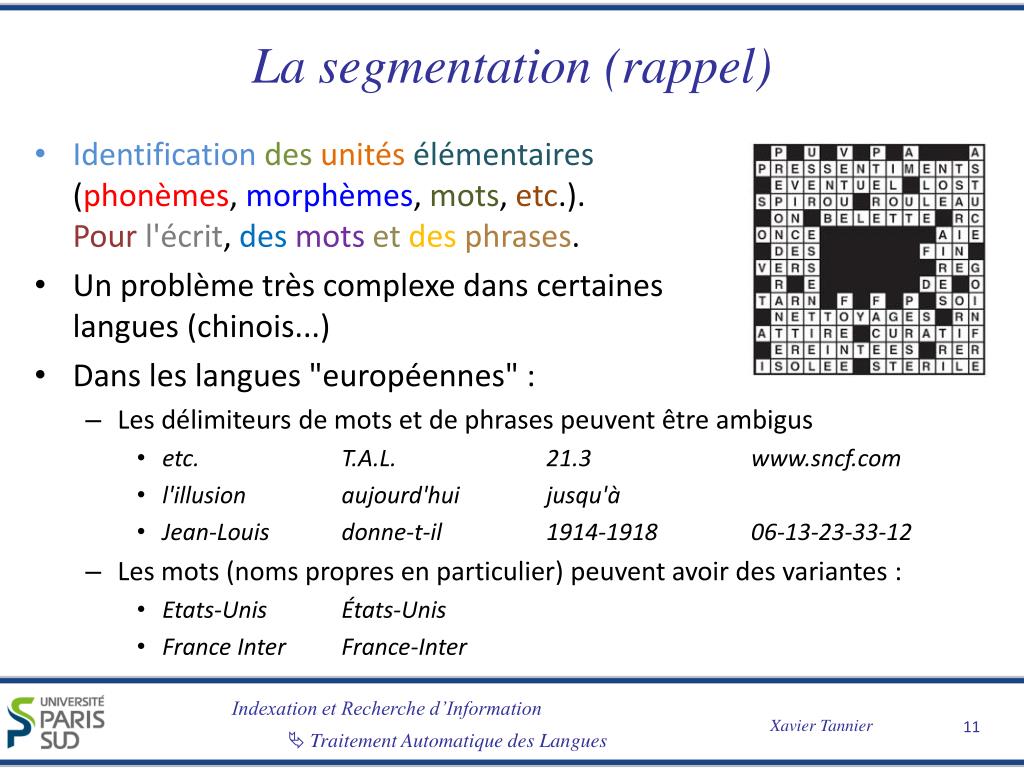 La segmentation (rappel) • Identificationdesunitésélémentaires(phonèmes, morphèmes, mots, etc.). Pourl'écrit, desmotsetdesphrases. • Un problème très complexe dans certaines langues (chinois...) • Dans les langues "européennes" : • Les délimiteurs de mots et de phrases peuvent être ambigus • etc. T.A.L. 21.3 www.sncf.com • l'illusion aujourd'hui jusqu'à • Jean-Louis donne-t-il 1914-1918 06-13-23-33-12 • Les mots (noms propres en particulier) peuvent avoir des variantes : • Etats-Unis États-Unis • France Inter France-Inter